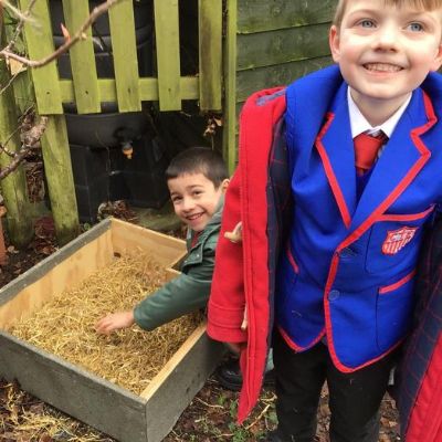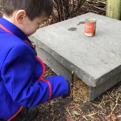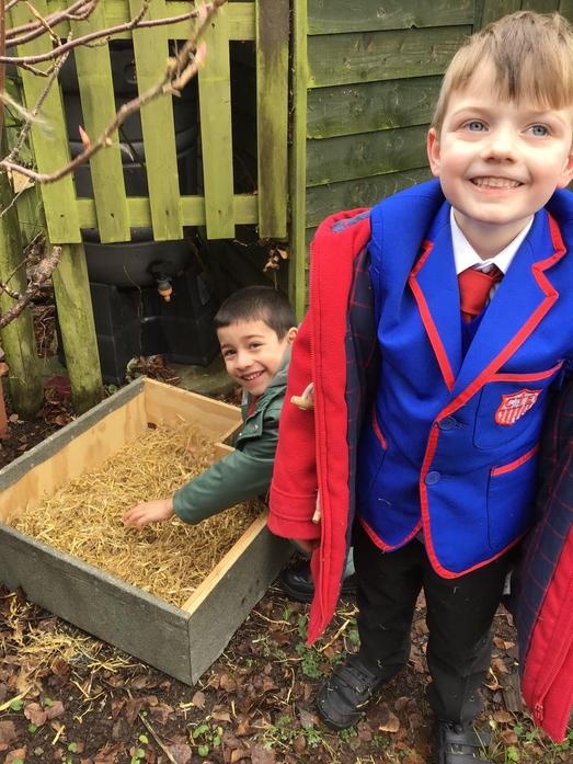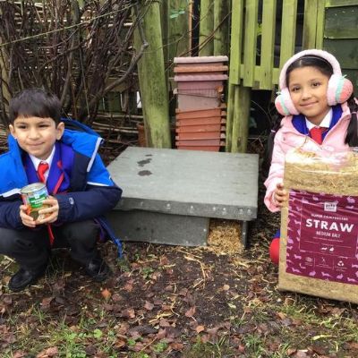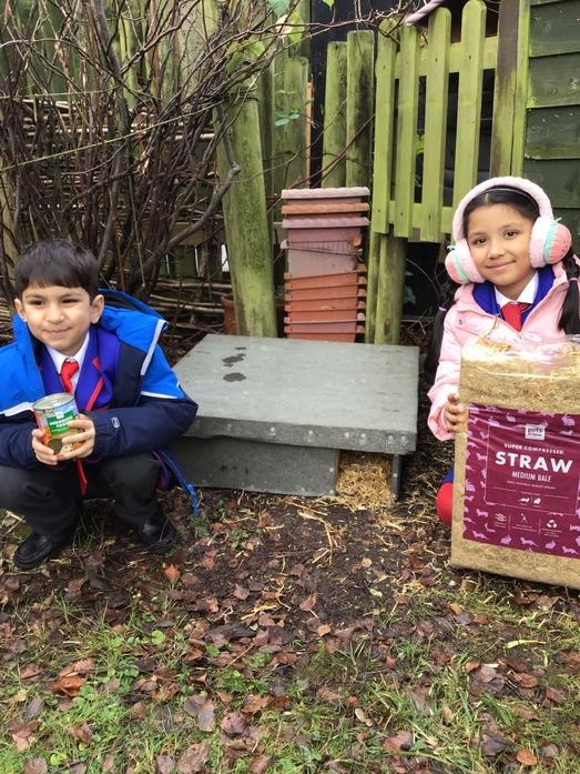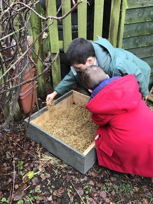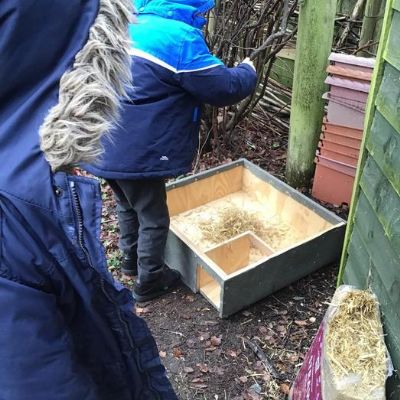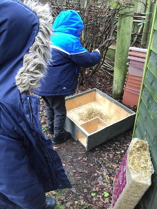 • We got a hedgehog home! We filled it with straw so that it will be warm, put hedgehog food out and left a stick in front to see if a hedgehog visits. We will keep checking!