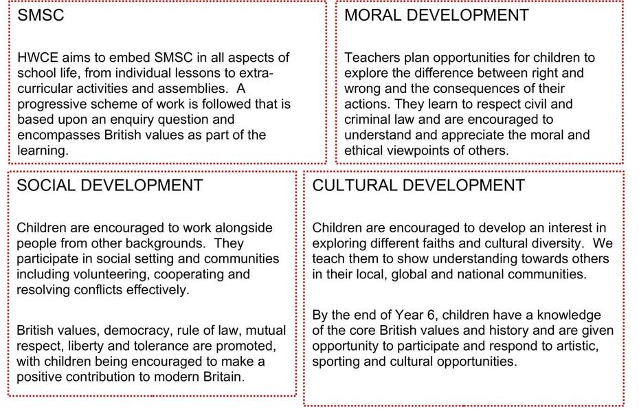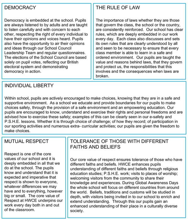 At HWCE these values are reinforced regularly and in the following ways: